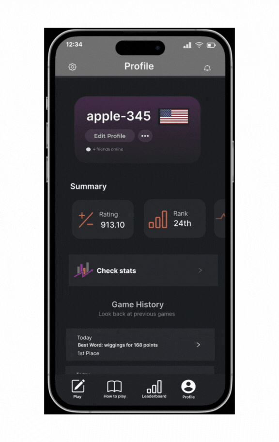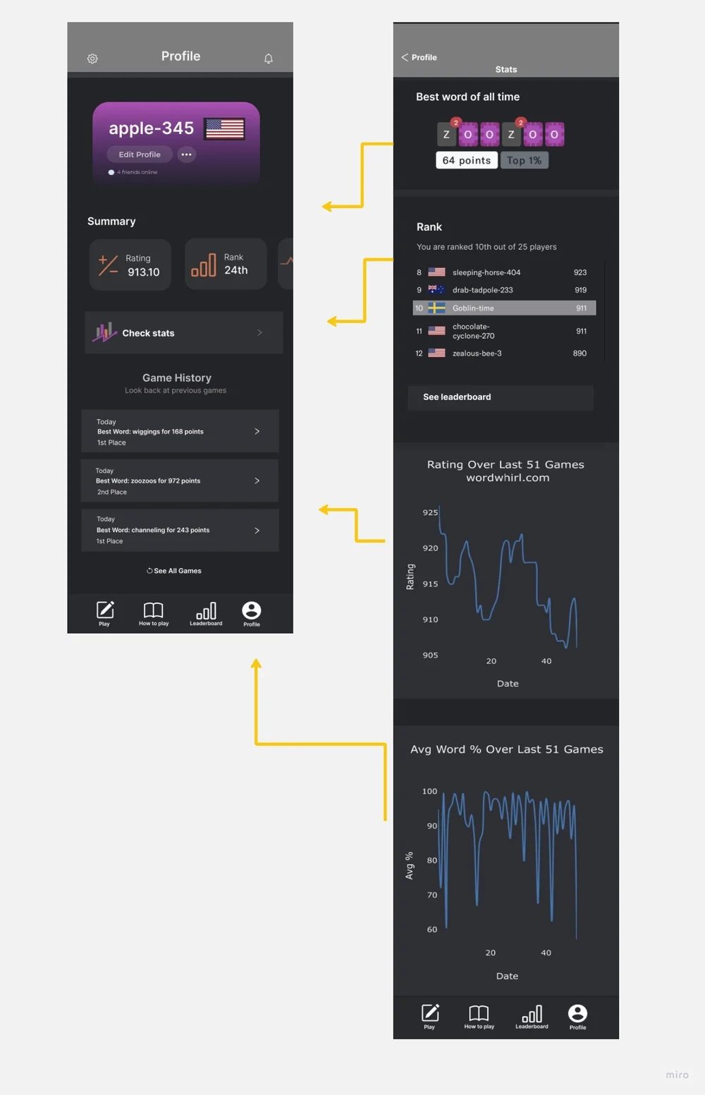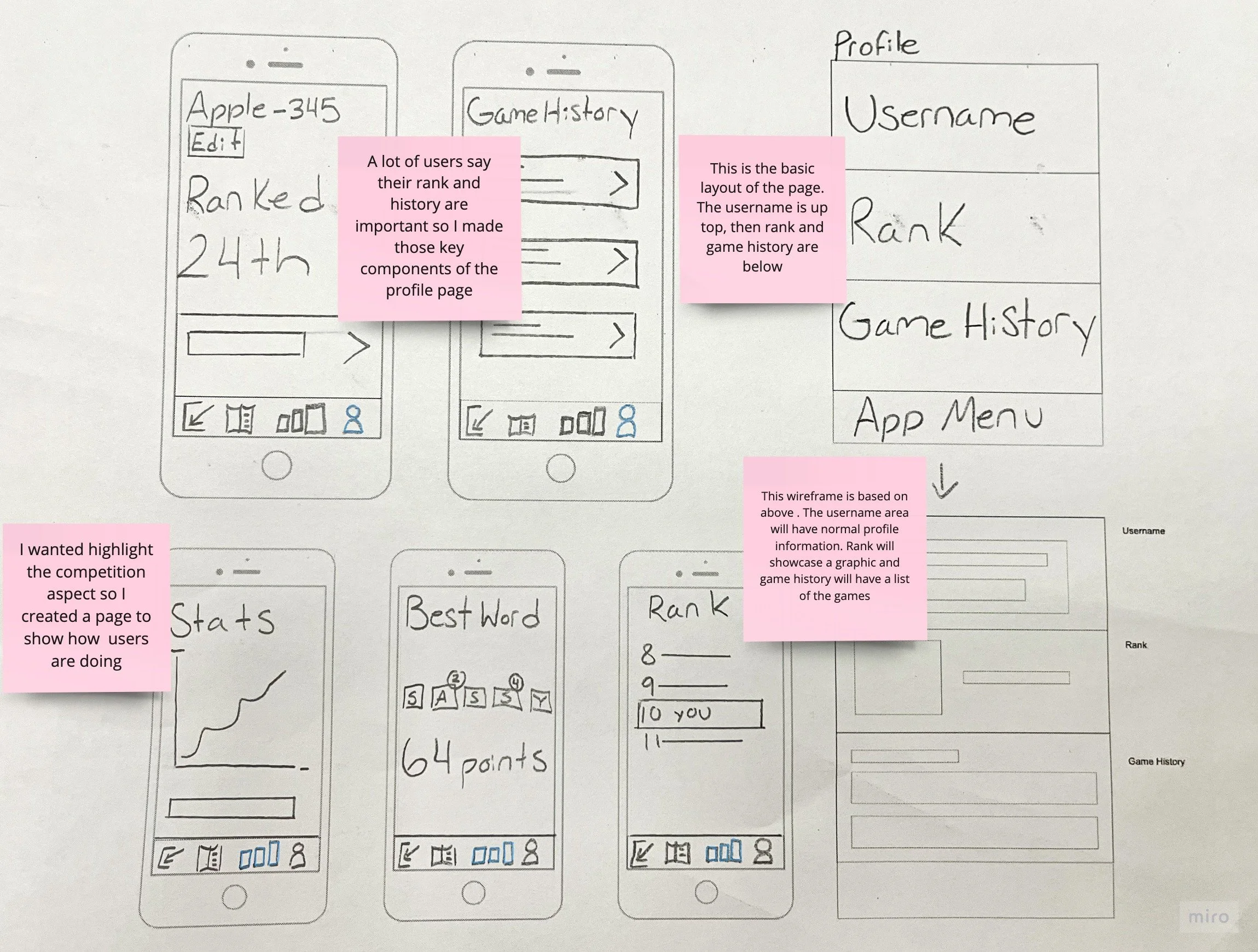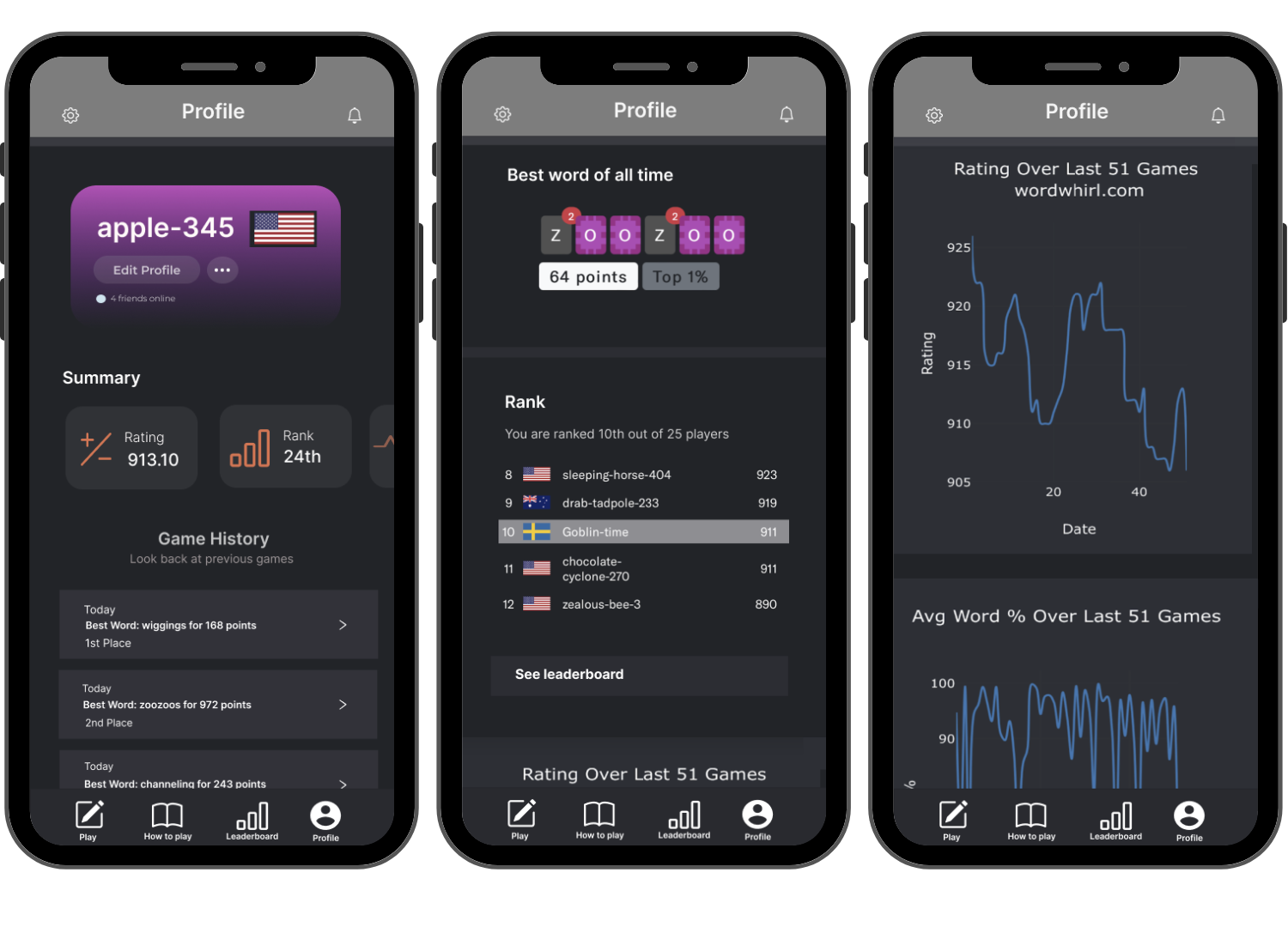 We had some loyal followers who played the game an average of 8 hours a week and were highly passionate about Word Whirl. After going back and forth on email, we set up a formal UX project based on our “cult followers.” Based on their feedback, I created a profile page that helped avid players learn about their stats and how to improve them.
