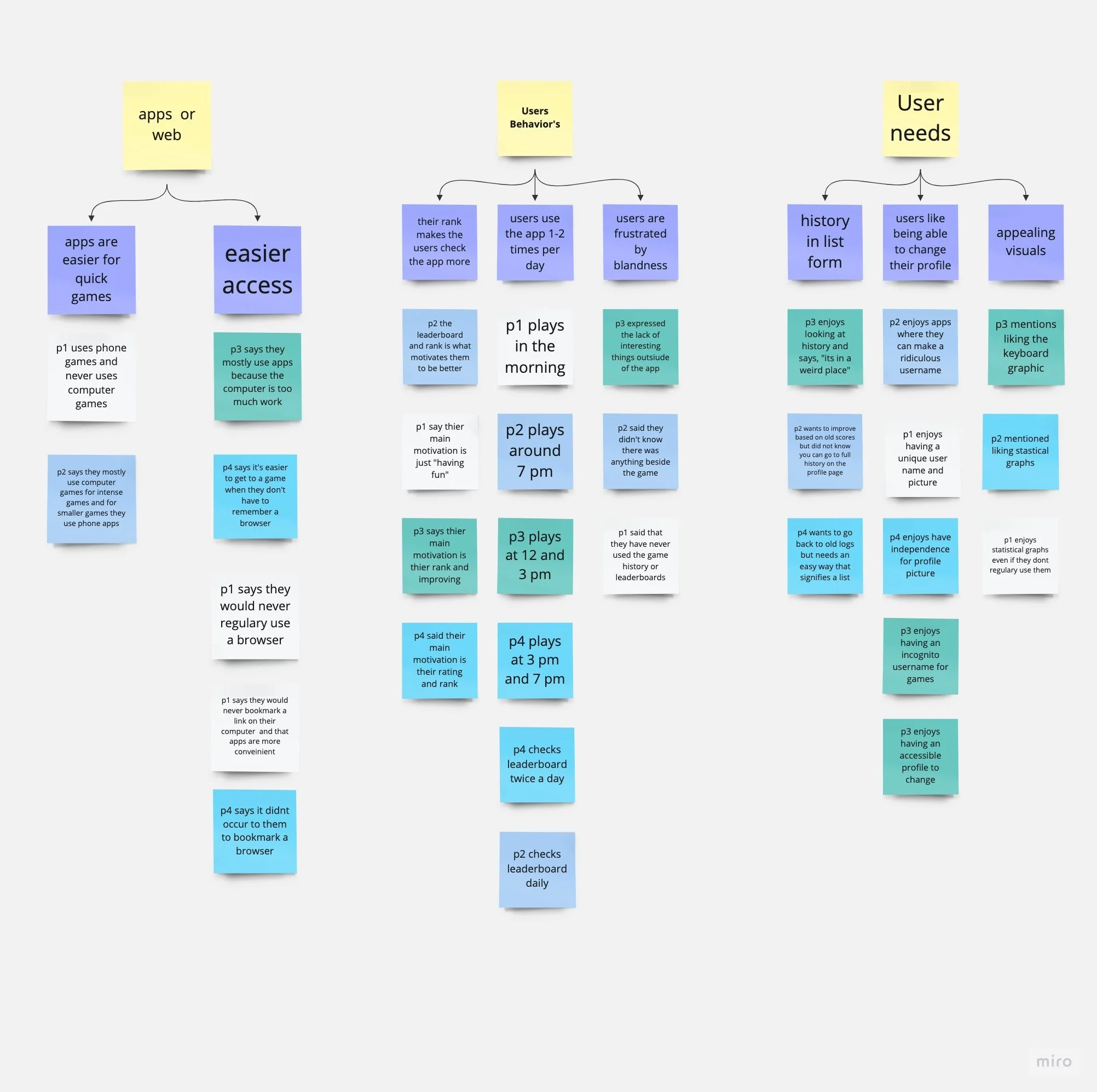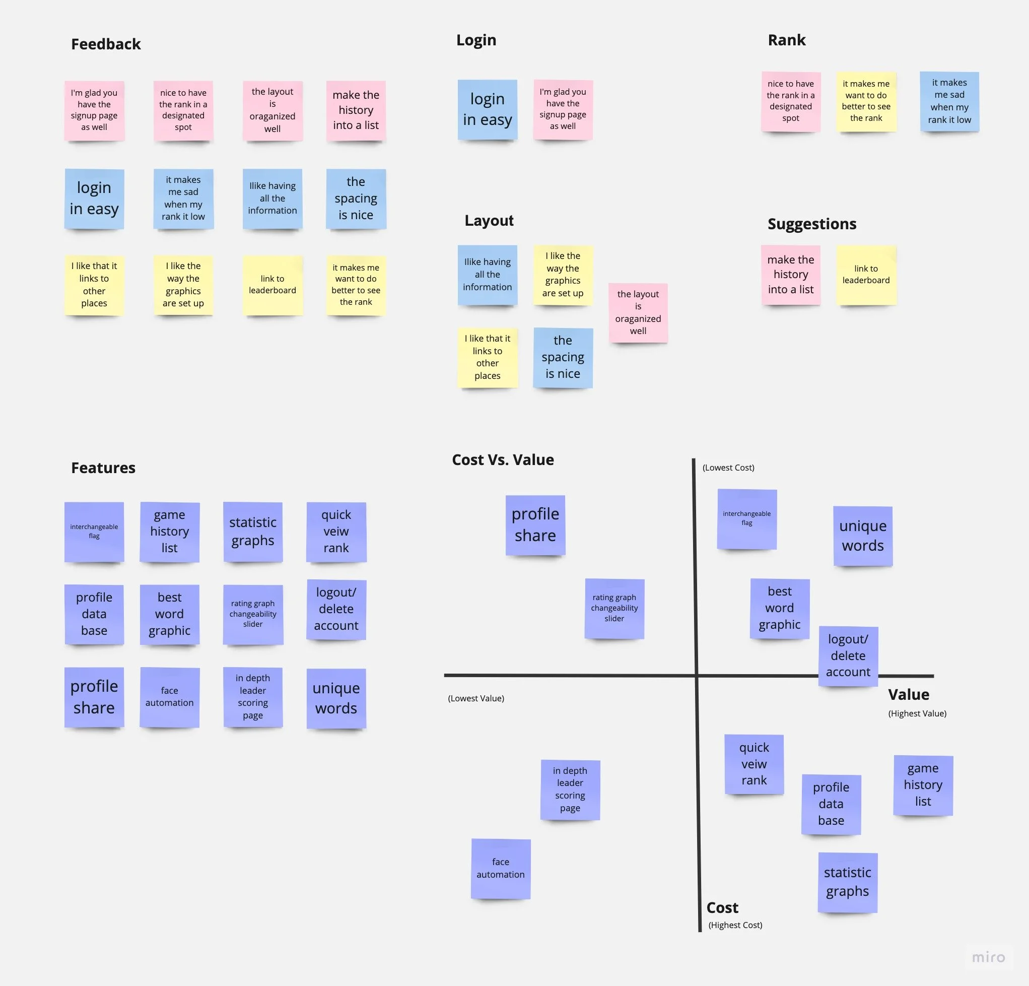 Above is the feedback we got from top users, and then those were made into groups of similarities on the right. The “features” above list features our users wanted to see on our page. From this research, we decided to create a profile and statistics page to satisfy our users' growing need for more information on their performance.